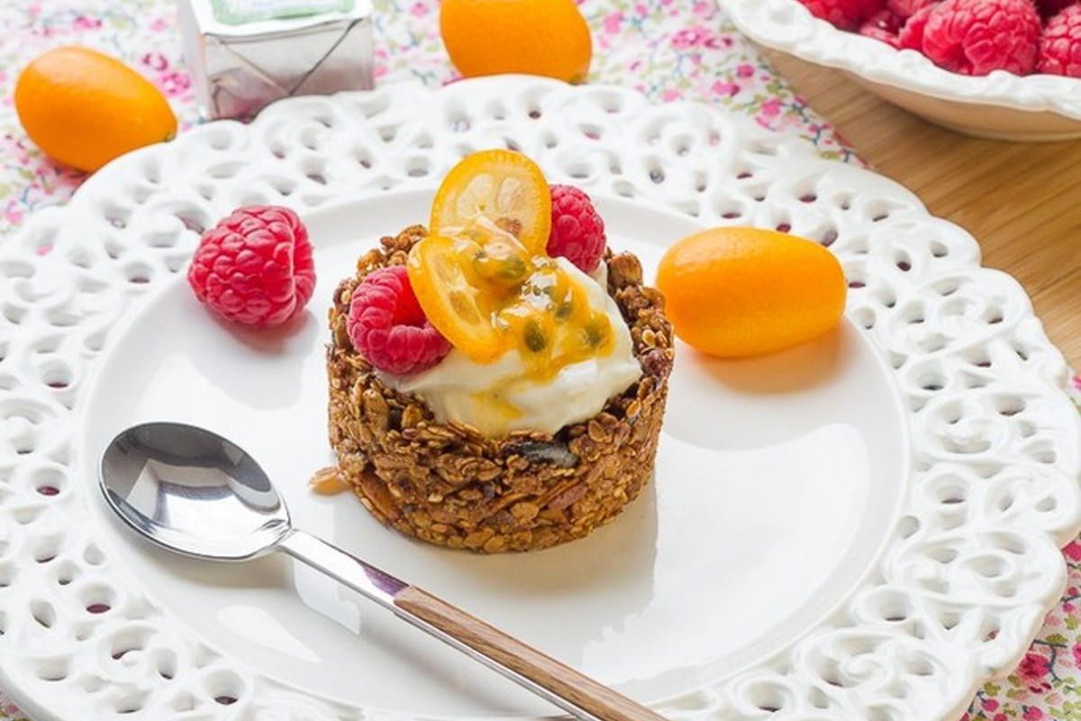 - Préchauffer le four à 160°C. Graisser une plaque à muffin et remplir chaque cavité avec le mélange de granola, en formant des coupelles.
