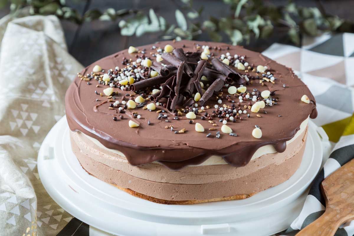 Je vous présente ici un entremet mousse aux trois chocolats, un vrai régal. Bien que la recette puisse sembler longue, elle se réalise en moins de deux heures et se conserve parfaitement au congélateur. Vous pouvez la préparer plusieurs jours à l'avance et n'aurez plus qu'à ajouter la décoration au moment de servir. Prévoyez toutefois 24 heures de décongélation au réfrigérateur pour une dégustation optimale.