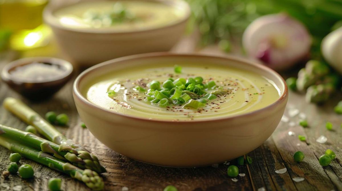 Dans une casserole, faites suer l'oignon avec un peu d'huile d'olive jusqu'à ce qu'il devienne translucide. Ensuite, déglacez en ajoutant un peu de bouillon de légumes pour obtenir une base savoureuse. Retirez les extrémités fibreuses des asperges, puis ajoutez le reste des asperges dans la casserole en les mixant finement au préalable. Laissez mijoter 20 minutes avec le bouillon restant, assaisonnez à votre goût.